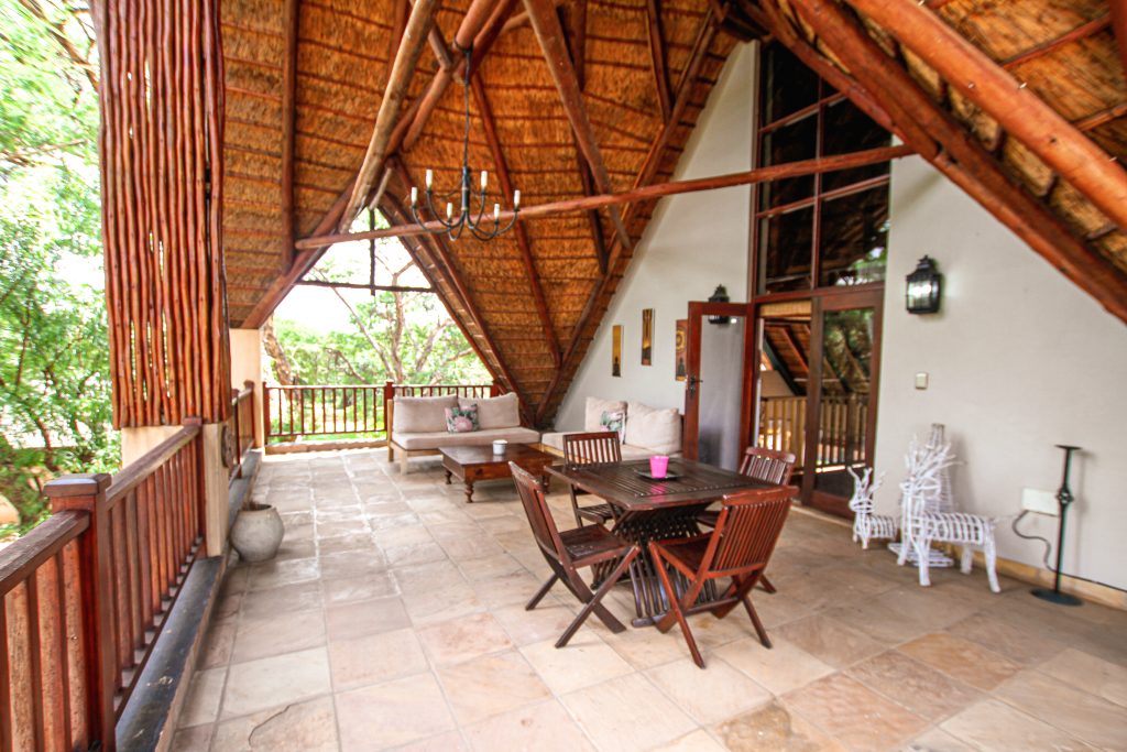 Upstairs, the TV lounge opens onto a peaceful sundowner deck. Perfect for capturing unforgettable sunsets. A shaded patio area invites quiet siestas or offers a peaceful spot to escape the excitement of the main lodge.